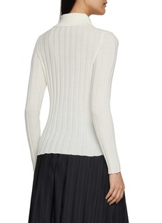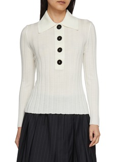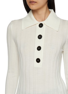 A refined study in line and proportion, this long-sleeved knit is spun from fine Italian merino wool and shaped by vertical ribbing that traces the body with quiet precision. Finished with a polished polo collar and mother-of-pearl buttons, it layers seamlessly from tailored days to understated evenings.