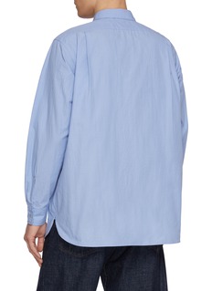 Nanamica's oversized shirt features a classic point collar, full-button placket, and patch chest pocket with subtle logo tab detailing. The relaxed, boxy silhouette with elongated hem offers contemporary layering versatility. A refined wardrobe essential that embodies Japanese minimalism and effortless sophistication.
