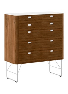 Balancing precision and warmth, the AK 2431 Chest of Drawers by Nissen & Gehl MDD refines everyday storage through clean geometry and material contrast. A smooth Corian top and handles offset the walnut body, while the steel base lends a light, architectural presence to modern interiors.