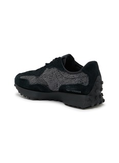 New Balance's 327 sneaker reimagines 1970s running heritage with an oversized N logo, mixed-texture paneling, and distinctive wraparound studded outsole. The lace-up design features a streamlined low-top silhouette with exaggerated proportions. A bold retro-modern statement piece that redefines classic sportswear aesthetics.