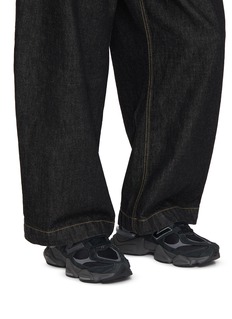 These New Balance sneakers encapsulate a bold, robust aesthetic with their chunky silhouette and all-black color scheme. Crafted with a blend of leather and mesh, these shoes offer both durability and breathability, ensuring comfort throughout the day. The prominent, oversized 'N' logo adds a distinct touch of brand identity, while the thick, sculpted rubber sole provides superior cushioning and traction.