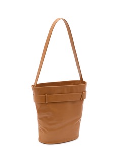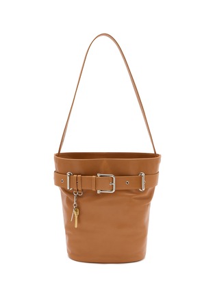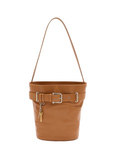 A sophisticated interpretation of utilitarian elegance, this bucket bag showcases equestrian-inspired details. The distinctive belt detail and key charm add heritage appeal, while the structured silhouette maintains contemporary refinement.