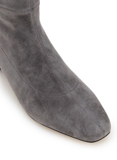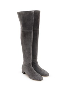 Minimalism meets quiet luxury in these suede thigh high boots, designed with a block heel that lifts with ease. The soft suede exterior and clean silhouette lend versatility—perfect with sharp tailoring by day or fluid mini skirts for evening refinement.