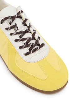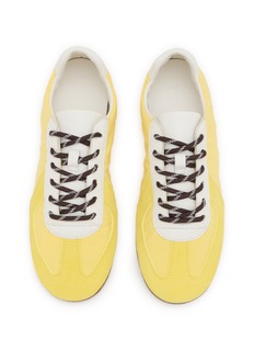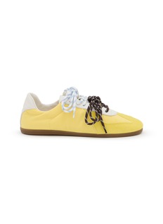 Inject a bright and playful element into your wardrobe with these Pedder Red sneakers, crafted in a vibrant yellow hue. The unique dual lace-up system in contrasting blue and brown adds a whimsical touch, while the sleek design maintains a chic edge.