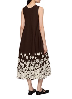 Soft volume and sculptural ease define the Alba dress by Pepa Pombo, crafted in a fluid knit that releases into a sweeping A-line shape. A deep neckline and blooming gradient florals anchor the silhouette in refined femininity—ideal for daytime elegance or artful evening layering.