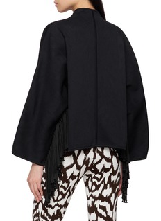 Pepa Pombo’s Calluna jacket blends sculptural volume with tactile movement. Its rounded, open-front silhouette is softened by flowing fringe along the sleeves, while oversized patch pockets ground the look with functional ease. A statement layer that elevates both tonal ensembles and patterned knits.