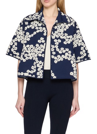 Defined by Pepa Pombo’s sculptural knit technique, this jacket is rendered in a graphic floral motif that brings dimension to its structured silhouette. The cropped shape and wide short sleeves create a modern, airy profile, while the zip front allows versatile layering over fitted tops or dresses.