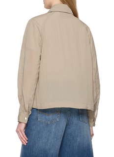 A refined interpretation of utility, this technical jacket is crafted in lightweight viscose nylon with a softly structured hand. The clean point collar and concealed placket create a streamlined front, balanced by oversized flap patch pockets. Layer it over denim or tailoring for effortless transitional dressing.
