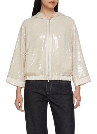 This Peserico sequin-embellished jacket blends effortless comfort with subtle sparkle; its delicate sequined fabric adds a touch of understated glamour to a practical silhouette. A versatile statement piece for day-to-night elegance.