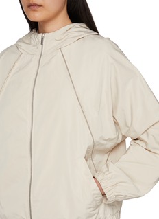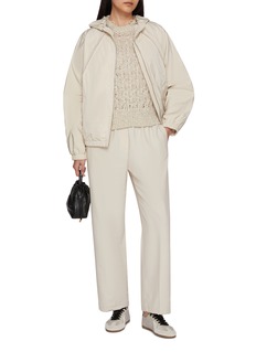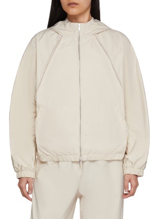 Peserico's hooded jacket features in a soothing beige hue to lend a timeless flair to your outerwear collection. With spacious pockets, hood and a sparkling trim, this piece blends functionality with a contemporary edge.