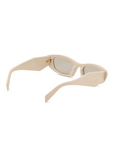 Crafted in a soft cream acetate, these oval sunglasses echo Prada’s sculptural minimalism with smooth contours and sharply carved temples. Gold-printed branding adds a subtle luminous contrast, while the cool-toned lenses bring a polished, modern finish ideal for refined daytime styling.