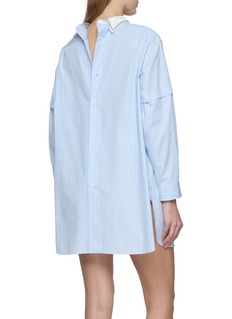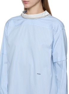 Prada reframes the precision of menswear shirting with a poetic twist in this striped cotton top. Its straight silhouette is punctuated by an embellished collar and an unexpected back button placket—an interplay of structure, sparkle and subversion that defines the house’s modern femininity. A crisp statement piece that elevates both tailoring and minimalist separates.