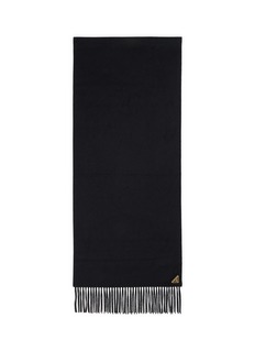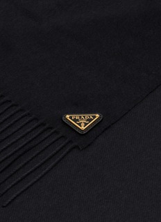 Wrap yourself in the sheer luxury of Prada's timeless black wool scarf. This elegant accessory is crafted from the finest wool, offering unmatched warmth and softness. Featuring a sophisticated, minimal design with the iconic Prada triangle logo in gold as a subtle embellishment, this scarf is the epitome of understated elegance. Its generous length and fringed edges add a touch of classic charm, perfect for enhancing any winter ensemble.