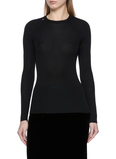 Minimalism is honed to its purest form in this superfine wool top, subtly accented by Prada’s signature logo pin at the shoulder. The lightweight ribbed knit traces the body with refined ease, creating a polished silhouette that layers effortlessly or stands alone with quiet sophistication.