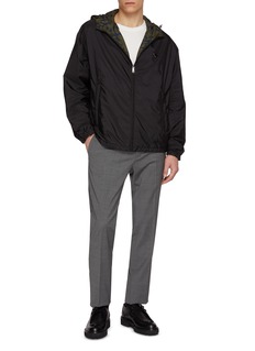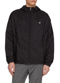 A study in duality, this reversible windbreaker balances utilitarian precision with graphic charm. Crafted from Prada’s signature Re-Nylon, it shifts from a minimalist black shell to a daisy-printed interior—ideal for transitional layering, city travel, or elevated off-duty dressing.