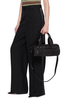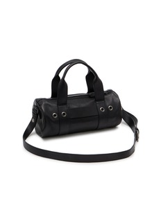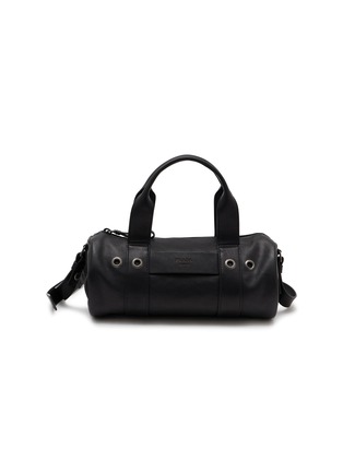 Prada delivers timeless sophistication with this compact duffle bag, featuring signature grommet detailing, dual top handles, and an adjustable crossbody strap for versatile carrying. The structured cylindrical silhouette with embossed logo and refined hardware showcases the house's masterful craftsmanship and understated luxury aesthetic.