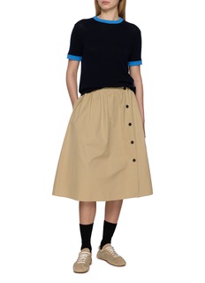 Soft structure meets graphic restraint in this short-sleeve knit top crafted from pure cashmere. Accented with contrast trims, the silhouette reflects Prada’s refined minimalism—lightweight yet polished, ideal for elevating everyday looks from tailored skirts to relaxed trousers.