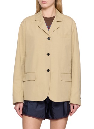 Discover the effortless elegance of this Prada blazer. The soothing beige hue lends a classic yet contemporary look, perfect for elevating any ensemble from business casual to evening wear.