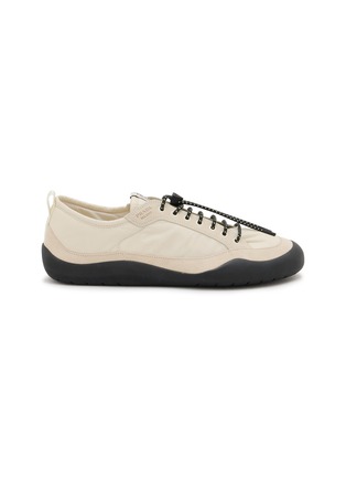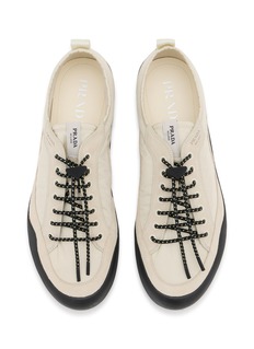 Prada explores modern minimalism with these distinctive low-profile sneakers, featuring contrast toe bumper, embossed logo detailing, and toggle-style lacing system. The streamlined slip-on silhouette with cushioned rubber sole ensures flexible comfort and grip, while utilitarian design elements create contemporary sporty sophistication.