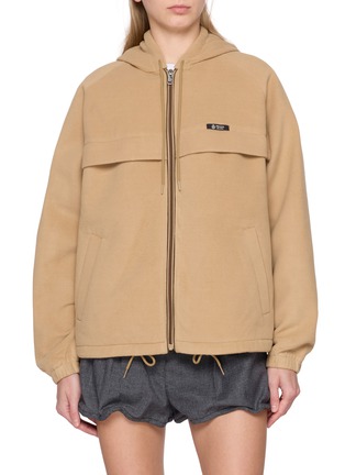 A refined balance of sport and precision, this zip-up jacket channels Prada’s quiet utility through softened structure and clean lines. The hooded silhouette lends ease to layered city dressing, equally attuned to transitional days and off-duty moments.