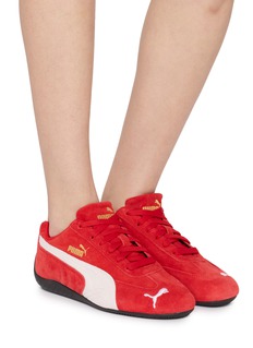 Elevate your casual footwear collection with these vibrant red PUMA suede sneakers. The iconic silhouette is rendered in a bold red suede, accented by contrasting white PUMA formstrip, ensuring a striking look. Crafted for comfort and style, these sneakers feature a padded collar and a cushioned footbed, perfect for all-day wear.