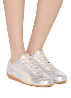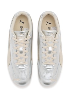 Elevate your athletic ensemble with these PUMA silver sneakers, epitomizing timeless style and modern functionality. These shoes boast a lustrous metallic finish complemented by soft beige accents, creating a standout look. Crafted for comfort with a cushioned footbed and a sleek, low-profile silhouette, these sneakers are perfect for both sporty activities and casual outings.