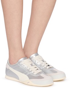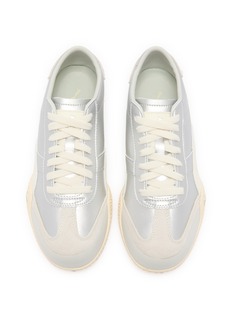 These Puma sneakers epitomize classic elegance with a contemporary twist. Crafted in a sleek, ice-white palette, they are designed with a smooth leather upper that adds a refined touch to your casualwear. The subtle Puma stripe in an understated off-white shade enhances the sophisticated look without overpowering the design. These shoes feature a low-profile silhouette and a durable rubber outsole that provides excellent traction and comfort.