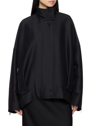 Structured yet fluid, this jacket by R2W is crafted from a smooth wool-silk blend that drapes with understated ease. The high neckline and relaxed volume lend a modern, cocooned silhouette, ideal for layering over slip dresses or pared-back tailoring.