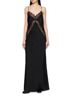 Defined by a refined, lingerie-inspired silhouette, this silk slip dress by R2W is framed with graphic lace panels that sculpt the body with quiet sensuality. Fluid and elongated, it transitions seamlessly from evening elegance to layered daytime looks.