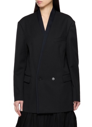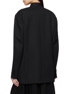 Tailored with understated distinction, this jacket by R2W features a refined layered collar that subtly reframes classic suiting codes. The clean lines and elongated silhouette offer a polished yet modern presence, pairing seamlessly with fluid skirts or structured trousers.