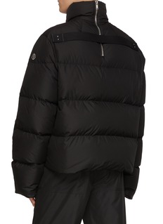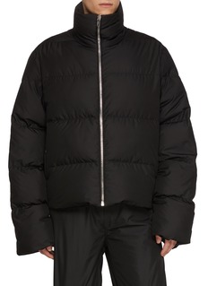 This jacket channels Rick Owens’ signature severity through inflated proportions and a sculptural stance. Crafted in crisp polyester taffeta, its cocooning volume and concealed back neck zipper create a quiet tension between protection and exposure—ideal for stark urban layering or nocturnal styling with fluid trousers and boots.