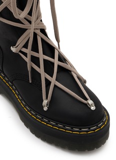 Dr. Martens meets Rick Owens' avant-garde aesthetics to reinvent the iconic 1B60 boot. Pentalace lacing, palladium hardware, and an extended geometric tongue create a bold statement. Quad soles with yellow stitching ground this edgy collaboration in unmistakable attitude.