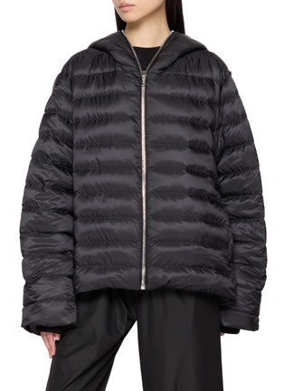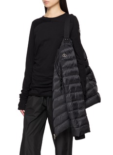 This Rick Owens x Moncler puffer redefines urban utility with its sculptural quilting and strap detail that allows the jacket to be carried over the shoulder. The matte black finish and minimalist design create a bold, architectural silhouette, perfect for layering with an avant-garde edge.
