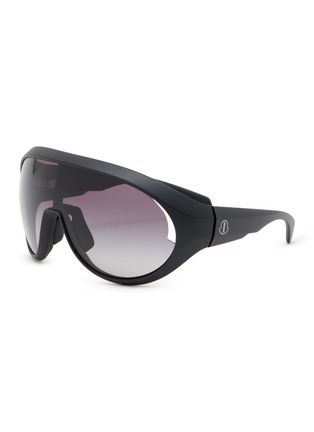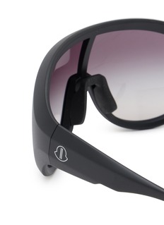 These Rick Owens sunglasses embody a bold and avant-garde aesthetic, crafted with sleek black frames and subtly tinted lenses. The design features a distinctive wrap-around style that not only ensures a snug fit but also offers ample protection from the sun's rays. The minimalistic white logo detail on the temple adds an understated signature touch.