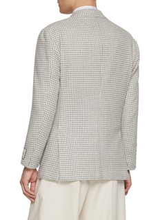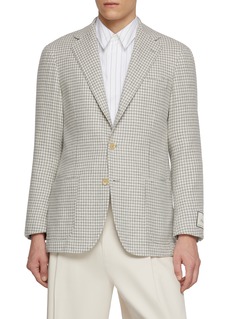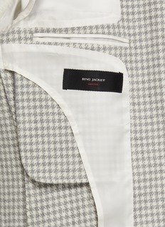 Embrace timeless style with Ring Jacket's houndstooth wool blazer, a perfect blend of classic design and modern tailoring. This blazer is meticulously crafted from premium wool, featuring a subtle yet distinctive houndstooth pattern that adds depth and character. With its notched lapels and dual-button closure, it offers a flattering fit for any occasion. The blazer is completed with buttoned cuffs and flap pockets, ensuring functionality alongside elegance. Ideal for both office wear and social gatherings.