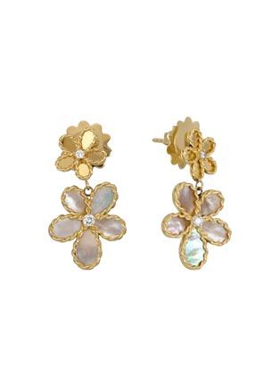 Designed as a gentle cascade of blossoms, these drop earrings reveal a layered interpretation of the Jasmine flower. White mother-of-pearl petals shimmer with natural depth, while diamonds and ruby punctuate the composition with refined brilliance—an elegant statement for both occasion dressing and elevated daily wear.