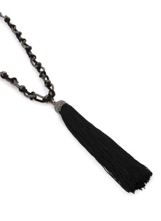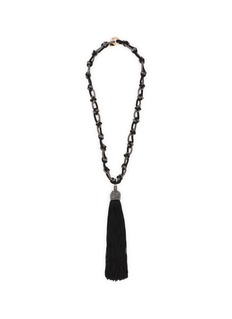The Legame necklace from Rosantica features a knotted chain and a cascading tassel, blending intricate craftsmanship with dramatic flair. The contrast of the textured necklace and fluidity of the tassel creates a striking statement, perfect for adding a touch of sophistication and movement to any ensemble.