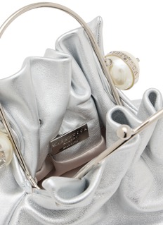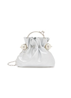 Discover the epitome of evening elegance with Rosantica's silver satin clutch. This exquisitely crafted accessory radiates sophistication, featuring a lustrous silver satin that gracefully gathers under a chic metallic clasp. The clutch is adorned with unique spherical accents that lend a modern touch to its timeless design. Completed with a sleek chain strap for versatility, this clutch is perfect for adding a refined sparkle to your formal ensembles.