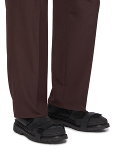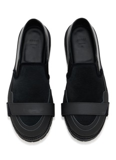 Sacai distorts the polish of a classic slip-on with hybrid tension, splicing plush suede with sculpted leather panels and a bold forefoot strap. The result is a structured, architectural silhouette that contrasts softness and rigidity. Style them with cropped trousers or fluid skirts to amplify their directional edge.
