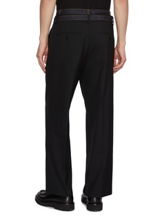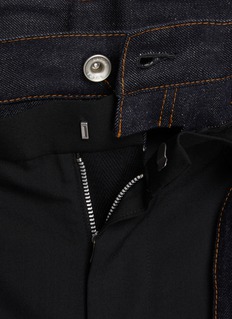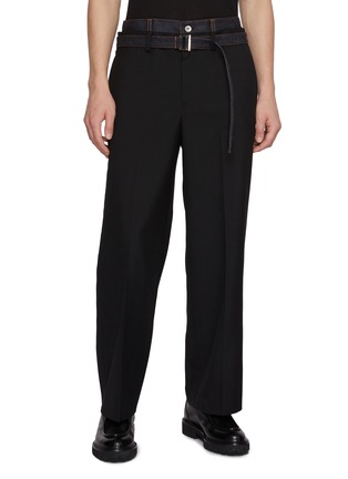 Defined by sacai’s hybrid tailoring language, these pants feature a crisp poly-wool suiting body accented with a layered denim waistband and integrated belt. The straight-leg silhouette maintains a clean line, while the double-waist construction introduces subtle contrast for modern, elevated everyday dressing.
