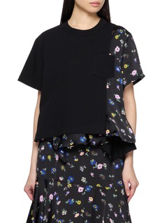 A familiar silhouette reworked through sacai’s hybrid lens, this T-shirt pairs a clean cotton jersey body with a fluid ditsy floral panel cascading along the side and back. The contrast introduces movement and depth, making it an expressive everyday piece styled effortlessly with skirts or tailoring.