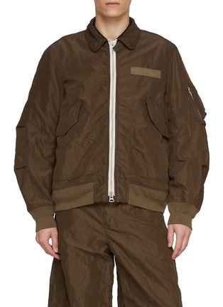 Rendered in a muted earth tone, this bomber jacket highlights sacai’s material experimentation through a softly crinkled nylon finish. The clean zip front and streamlined silhouette balance utility with restraint, making it an effortless outer layer for transitional, everyday styling.
