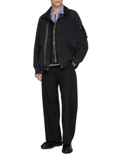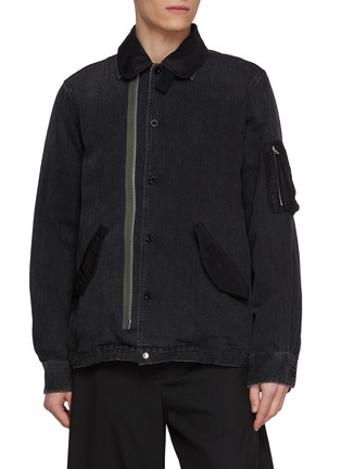 sacai’s hybrid language is distilled into this dark-wash denim jacket, where classic workwear structure is disrupted by nylon inserts and dual fastenings. The layered construction sharpens the oversized silhouette, balancing utilitarian function with a refined, directional edge suited to modern city dressing.