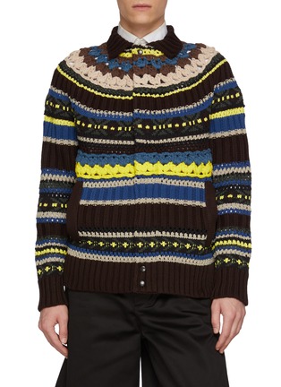 sacai elevates traditional Fairisle with bold colour blocking and a layered knit construction that feels both graphic and tactile. Finished with a point collar and zip front, this jacket bridges craft and contemporary styling—ideal worn over shirting for depth-driven, directional looks.