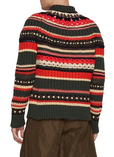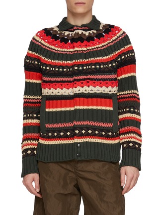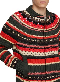 Bold colour contrasts and layered stitch work bring a tactile richness to this sacai jacket, where Fairisle traditions are reworked through a contemporary lens. Finished with a point collar and zip front, it adds graphic impact to everyday looks, styled simply over shirts or soft tailoring.