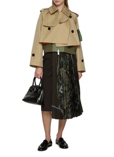 A masterpiece of design fusion, discover sacai's hybrid aesthetics with this short trench jacket rendered in a mix of beige, green and orange. With a comfy relaxed fit, this piece is the combination of a trench coat and a classic blouson jacket using the brand's refined craftsmanship.