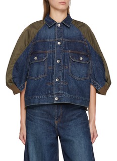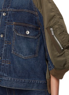 This sacai denim jacket exemplifies a masterful blend of utility and contemporary style, featuring a bicolour palette for a utilitarian flair. Crafted in a relaxed fit, it includes a contrast raglan sleeves and flap pockets, enhancing both functionality and aesthetic appeal.