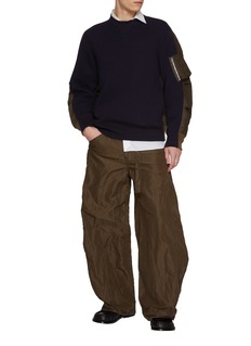 sacai’s hybrid language takes shape in this sweatshirt, where sponge sweat cotton meets utilitarian nylon sleeves. The contrast of soft structure and technical detailing sharpens a familiar silhouette, ideal for elevated off-duty styling or layered city looks.