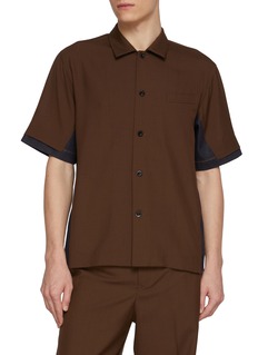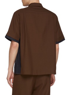This short-sleeve shirt blends tailored suiting with utilitarian contrast, combining smooth poly-wool fabric with denim panels at the underarm. The clean silhouette is sharpened by precise construction, offering a refined yet unconventional approach to modern shirting.