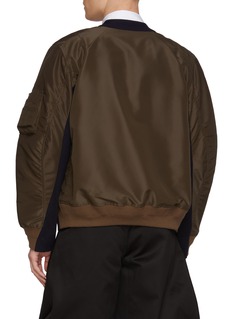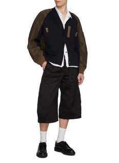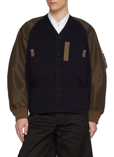 Blurring the line between knitwear and outerwear, this sacai cardigan pairs a soft cotton-blend knit body with voluminous nylon sleeves. The contrast in textures creates a sculptural silhouette, lending a layered, utilitarian edge to refined everyday looks.